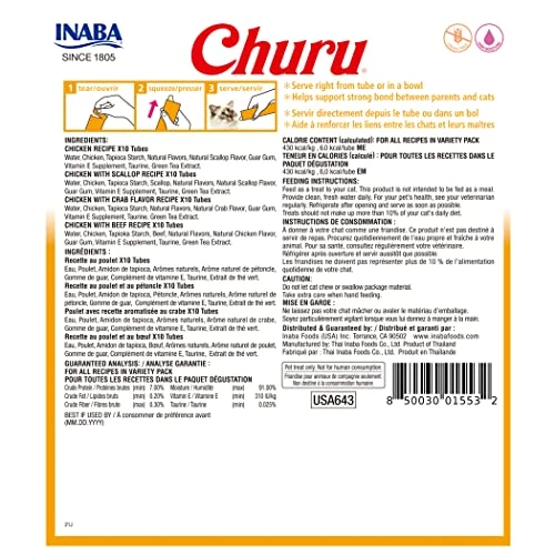 - KEEP YOUR FELINE HYDRATED WITHOUT ADDING CALORIES: Each delicious, creamy Churu tube contains 91% moisture and only 6 calories (a tenth of the calories of traditional dry cat treats), which makes it a healthy snack you can feel good about feeding