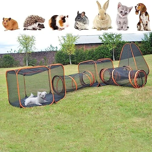 - 【OUTDOOR AND INDOOR USE】The play tent provides fresh air for pets, and it can also be used safely outdoors, so that small animals can also enjoy the sun without worrying about them getting hurt or running away. People can also place food trays and cat beds inside the tent.