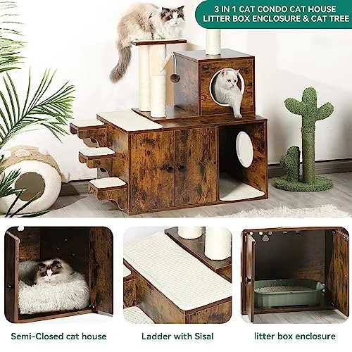 - Private Haven for 3-4 Kitties: Bottom cabinet can be used as a hidden litter box with breathable vents for odor control; Activity room beside the litter box provides a playground and versatile access; Upper semi-closed cat bed with bonus soft cushion creates a private oasis catering to cat’s sleeping habits; Use both of the bottom cabinets as cat beds to spaciously house 3-4 cats